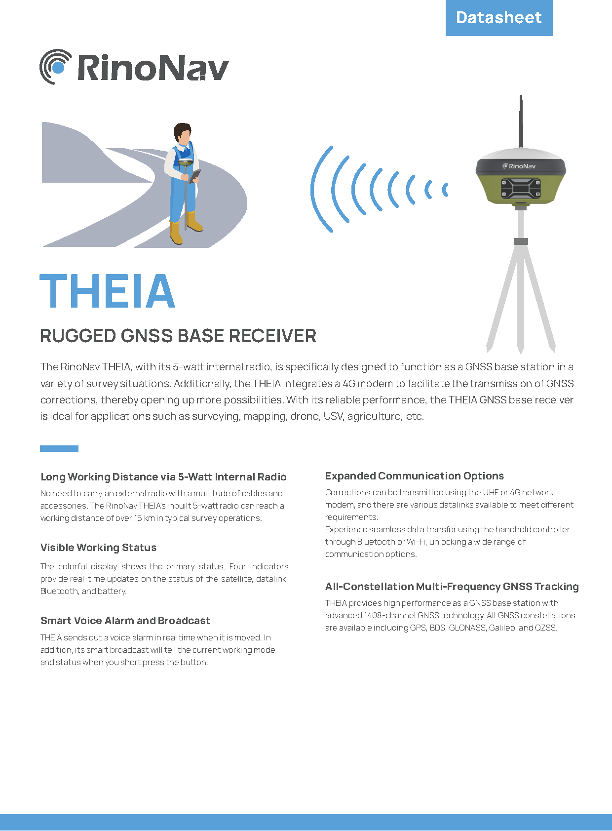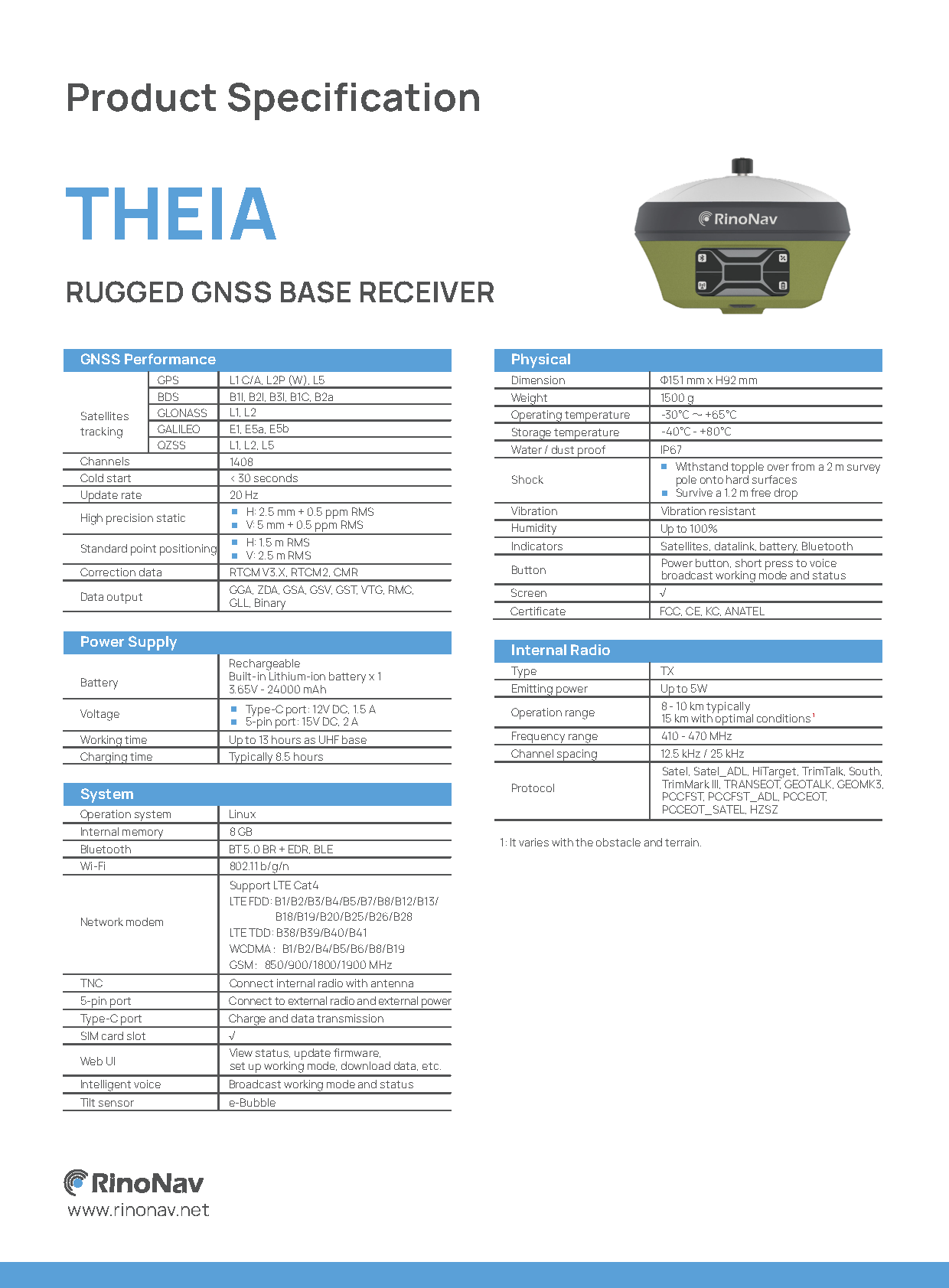 THEIA со встроенной 5-ваттной внутренней радиостанцией специально разработан для работы в качестве базовой станции ГНСС в различных геодезических ситуациях. Кроме того, THEIA интегрирует 4G-модем для передачи ГНСС-поправок, открывая тем самым дополнительные возможности. Благодаря надёжной производительности базовый приёмник ГНСС THEIA идеально подходит для таких применений, как геодезия, картографирование, беспилотные летательные аппараты (дроны), необитаемые надводные суда (USV), сельское хозяйство и др.